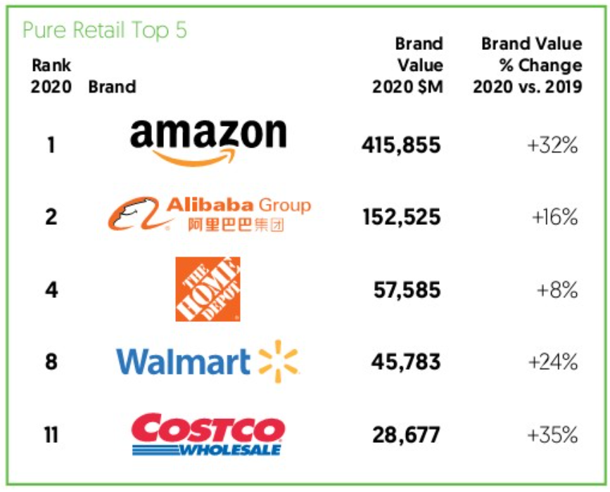 純零售類品牌價值排名前五的品牌依次是:Amazon,阿里巴巴,The Home Depot, Walmart 和Costco 。以上品牌的價值均獲得了不同程度的增長。