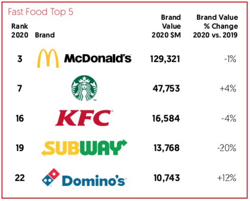 快餐類品牌價值排名前五的品牌依次是:McDonald’s、StarbucksKFC 、SUBWAY 、Domino’s 。