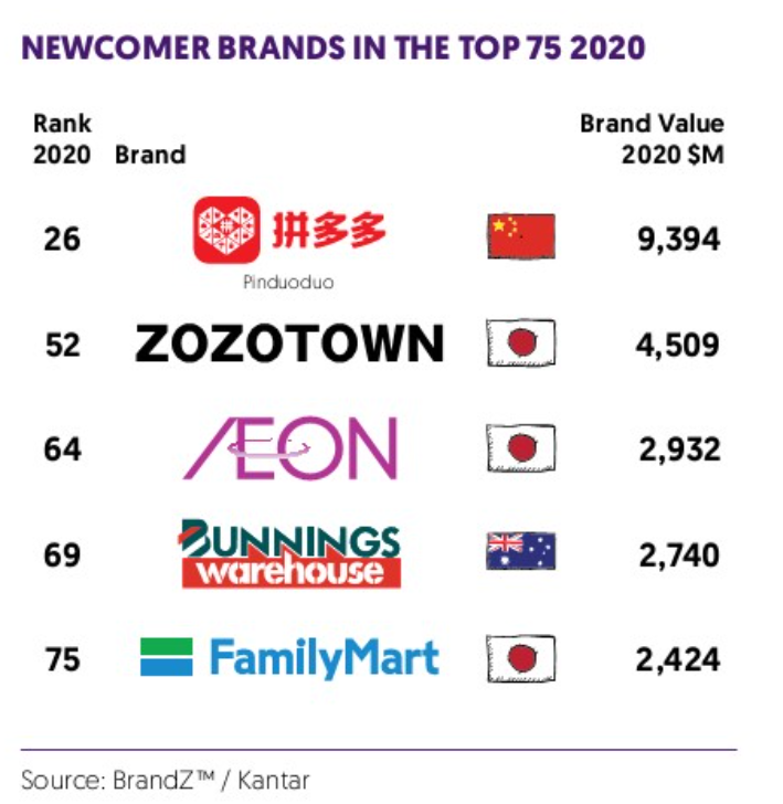 3)五個新入榜品牌:依託在線團購模式高速成長的中國電商平台拼多多(第26名,94億美元),日本潮流服飾電商平台Zozotown(第52名,45億美元),日本百貨零售商Aeon永旺(第64名,29億美元),日本連鎖便利店全家FamilyMart(第75名,24億美元),澳洲的五金連鎖超市Bunnings(第69名,27億美元)。