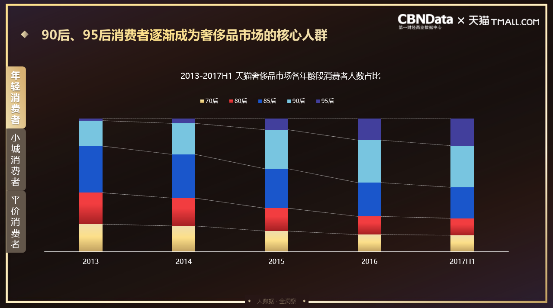 根據CBNData x 天貓《2017新零售時代奢侈品消費趨勢報告》顯示,作為奢侈品市場的核心人群,90後、95後消費者在天貓奢侈品市場中的人數佔比正逐年攀升。