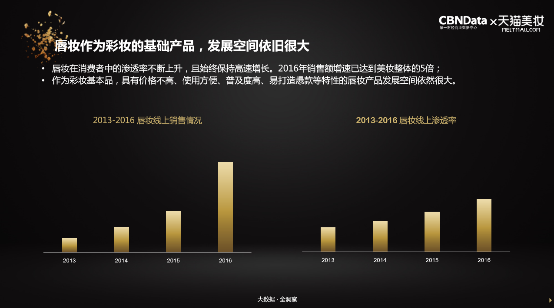 在彩妝界,有這樣一句名言「女人的化妝包里永遠缺一支口紅」。這話是否有跡可循呢?來看看CBNData x 天貓美妝《2017中國美妝個護消費趨勢報告》怎麼說!數據顯示,作為彩妝基礎產品,唇妝在消費者中的滲透率始終保持高速增長,2016年唇妝的線上銷售額增速已達到整體美妝的5倍。