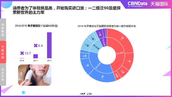 其中有助於提升護膚品吸收力和效果的美容儀正受到時下年輕消費者的積極嚐鮮。根據CBNData x 天貓國際《進口消費洞察報告》顯示,從2014年到2016年,電子美容儀的天貓國際銷售額實現了爆炸式增長,其中一二級城市的泛90後是主力軍。黑科技誰不愛?年輕的你想不想來一把?