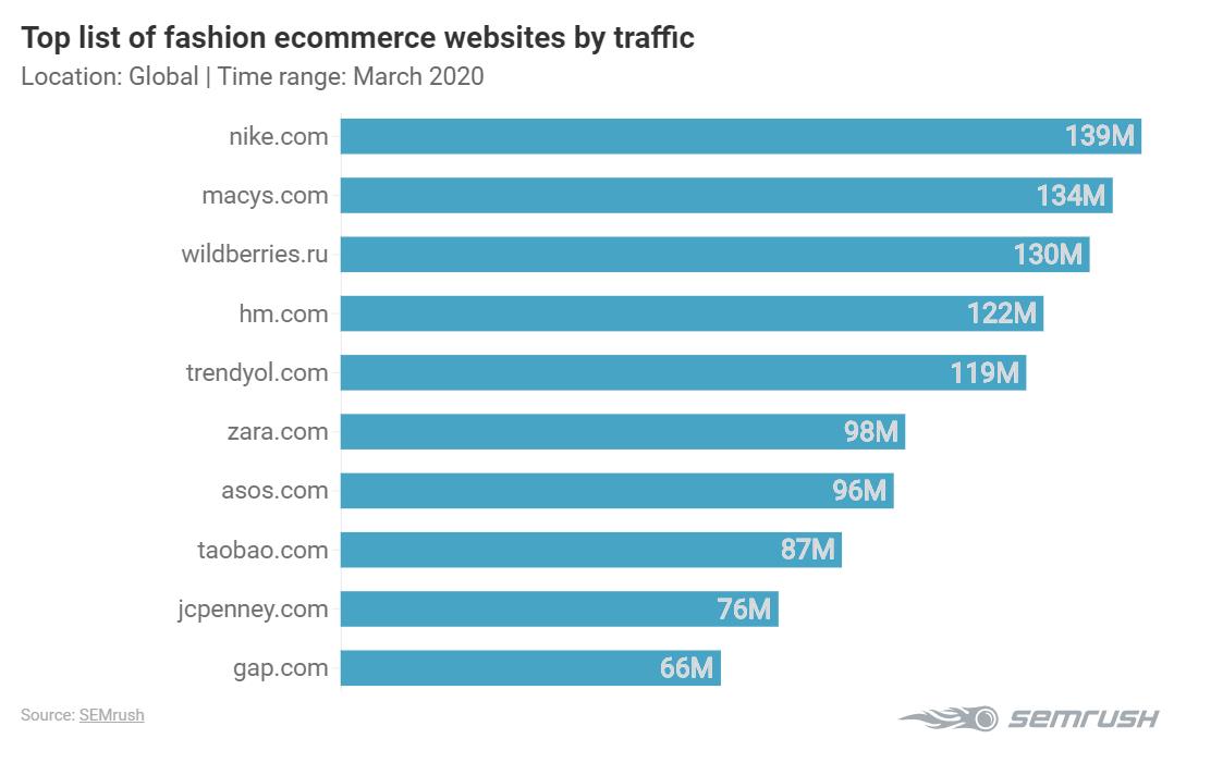 2020年3月,全球時尚類網站訪問總量同比增長5%至26.2億人次。其中,Nike以1.39億人次的訪問量位列第一,美國老牌百貨公司梅西百貨(Macy’s)與俄羅斯時尚電商平台wildberries以1.34億訪問量與1.3億訪問量分別位列第二、第三。