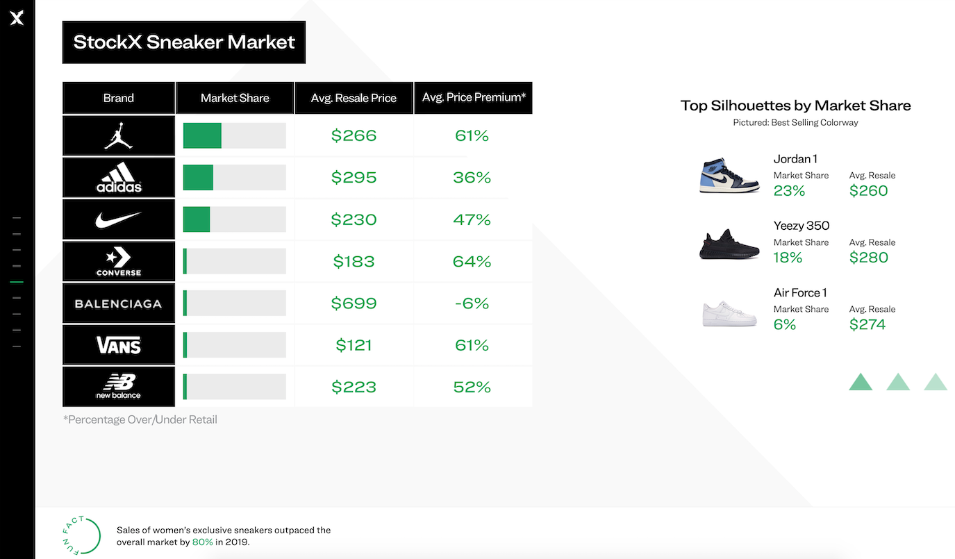 據美國運動鞋交易平台StockX公佈的2019年的寄售行業現狀報告,就市場份額來看,Jordan成為2019年StockX交易量最大的運動鞋品牌,平均轉售價格266美元,較零售價格平均漲幅為 61%,交易量及漲幅均超過adidas和Nike;Jordan 1成為最暢銷的運動鞋款式,市場份額佔到了23%。