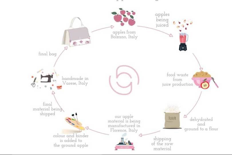 該品牌的創始人 Schenker 表示,她做了很多工作才說服了義大利的合作生產商來為她生產以蘋果殘渣為原料的手袋,告訴他們這種環保努力是值得的。儘管很多消費者很欣賞環保材料的創意,但以蘋果作為原材料還是和傳統的皮革和人造皮革是非常不同的。要把蘋果殘渣變為能做成包的材料前期需要做大量的工作: