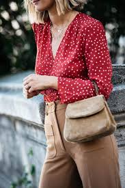 似乎紅色的波點襯衫更有復古調調,打眼一看真有幾分畫報女郎的feel,配一條卡其色高腰褲,隨手挎一個小包,展現經典風味。