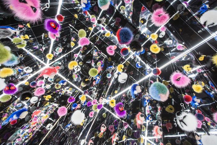 這個自拍空間由數面鏡子和Fendi這兩年熱賣的毛球配飾組成,創意原理與日本藝術家草間彌生的鏡屋十分相似。當近兩百個毛球小怪物(Bag Bugs)從鏡子屋的頂端懸掛而下,任誰走進去都會覺得自己置身於一個毛球的海洋。品牌把這個屋子命名為 Obsession Room(癡迷屋)。其用意不言而喻。