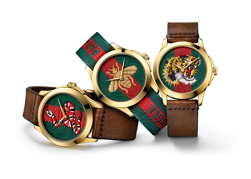 Gucci Le Marché des Merveilles 系列有多種錶款風格組合,刺繡風的錶盤搭配織物或小牛皮錶帶,充分展現GUCCI的品牌識別度。Gucci Dive 系列則在 40mm 直徑錶盤基礎上採用精鋼錶殼、橡膠錶帶加上錶盤上霸氣的 3D 立體浮雕虎頭組合,它採用瑞士 Ronda 石英機芯,支援 200 米防水深度,是一款兼顧時尚與運動的表款之選。