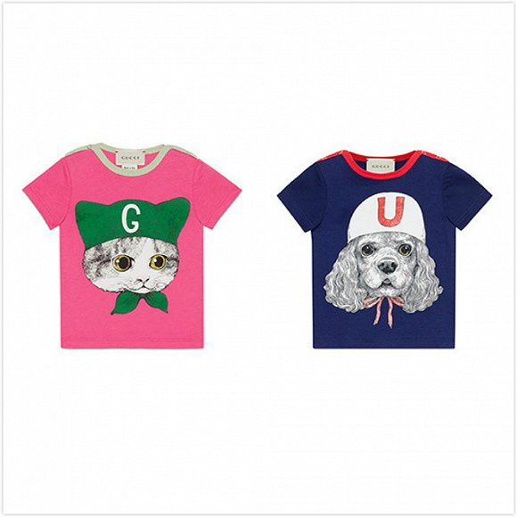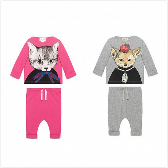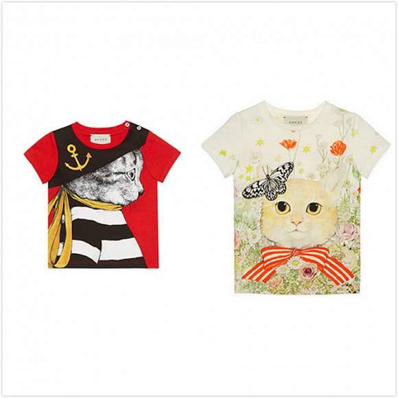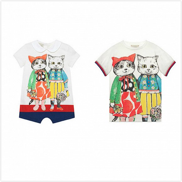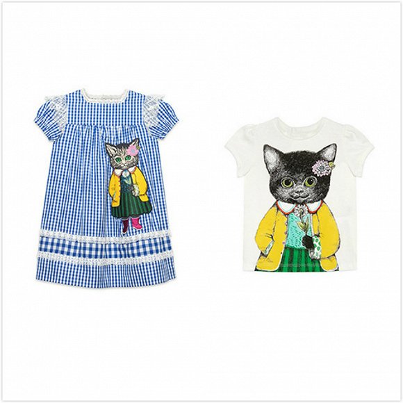 合作系列包括男女童T卹、連衣裙、連體裝、雙肩背包和托特包,樋口裕子的插畫是主要的設計點,畫中的貓咪全都懵懂可愛,一雙人畜無害的無辜大眼睛是賣萌的標配。可以看出畫中貓咪身上的華服來自Gucci的經典成衣系列,這個系列也就具有了獨特的意義。