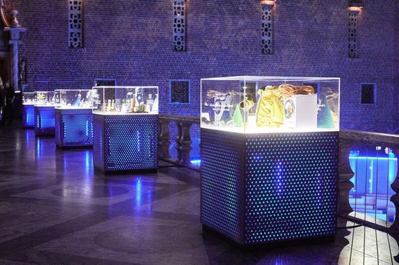 在瑞典市政廳舉行的頒獎晚宴上,它們的展示樣品被分別放在五個透明展台中,供人們近距離觀察。
