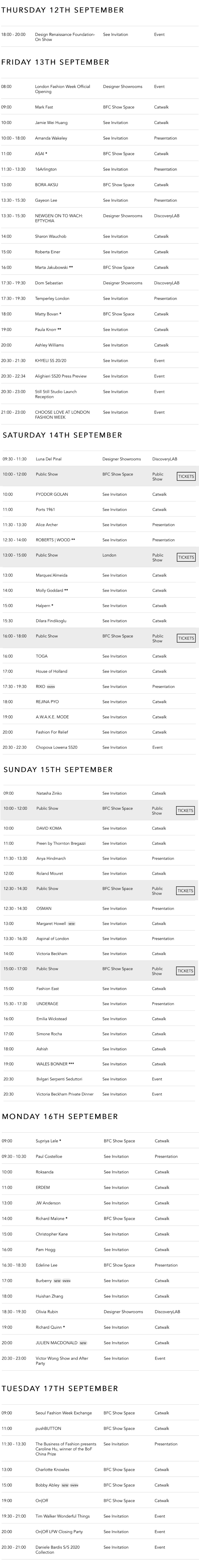 BFC 指出,以創意和創新聞名,倫敦時裝周每年會吸引50多個國家的媒體、買手和業內人士前往倫敦尋覓和挖掘創意人才。鑑於時尚行業的不斷演變,一般民眾對倫敦時裝周的興趣日益增長,決定推出全新的時裝週日程安排,提高設計師業務的公眾參與度,助其吸引更多的消費者。