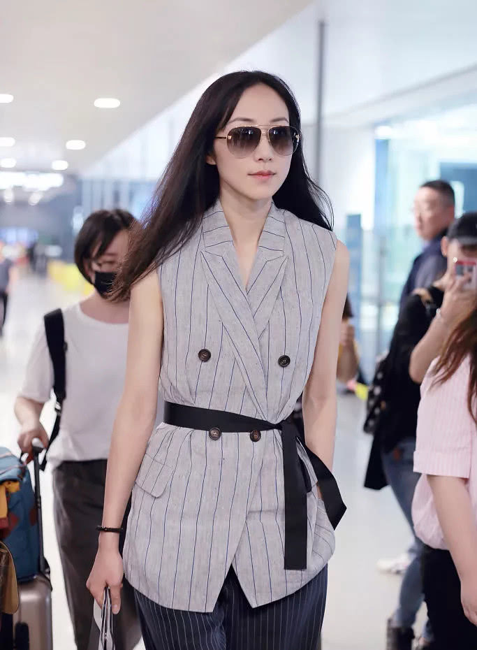 如果你是長腿小仙女,則可以像韓雪這樣,選擇束腰西裝馬甲知性優雅又不失時尚帥氣。
