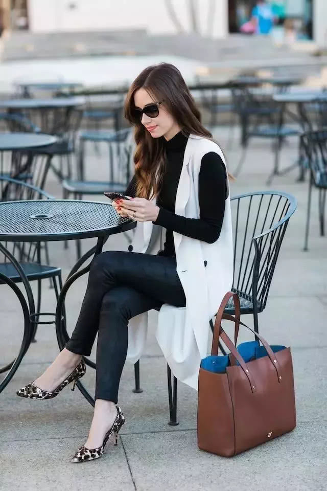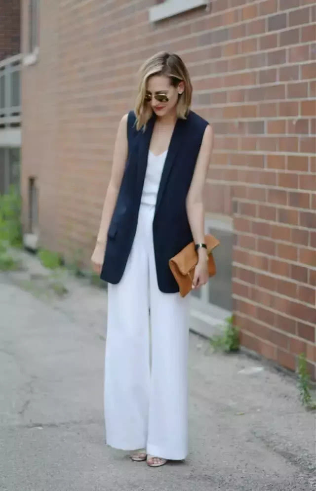 內搭同色上衣和褲子,外搭 H 型長馬甲,在視覺上也會更加顯瘦遮肉呢~