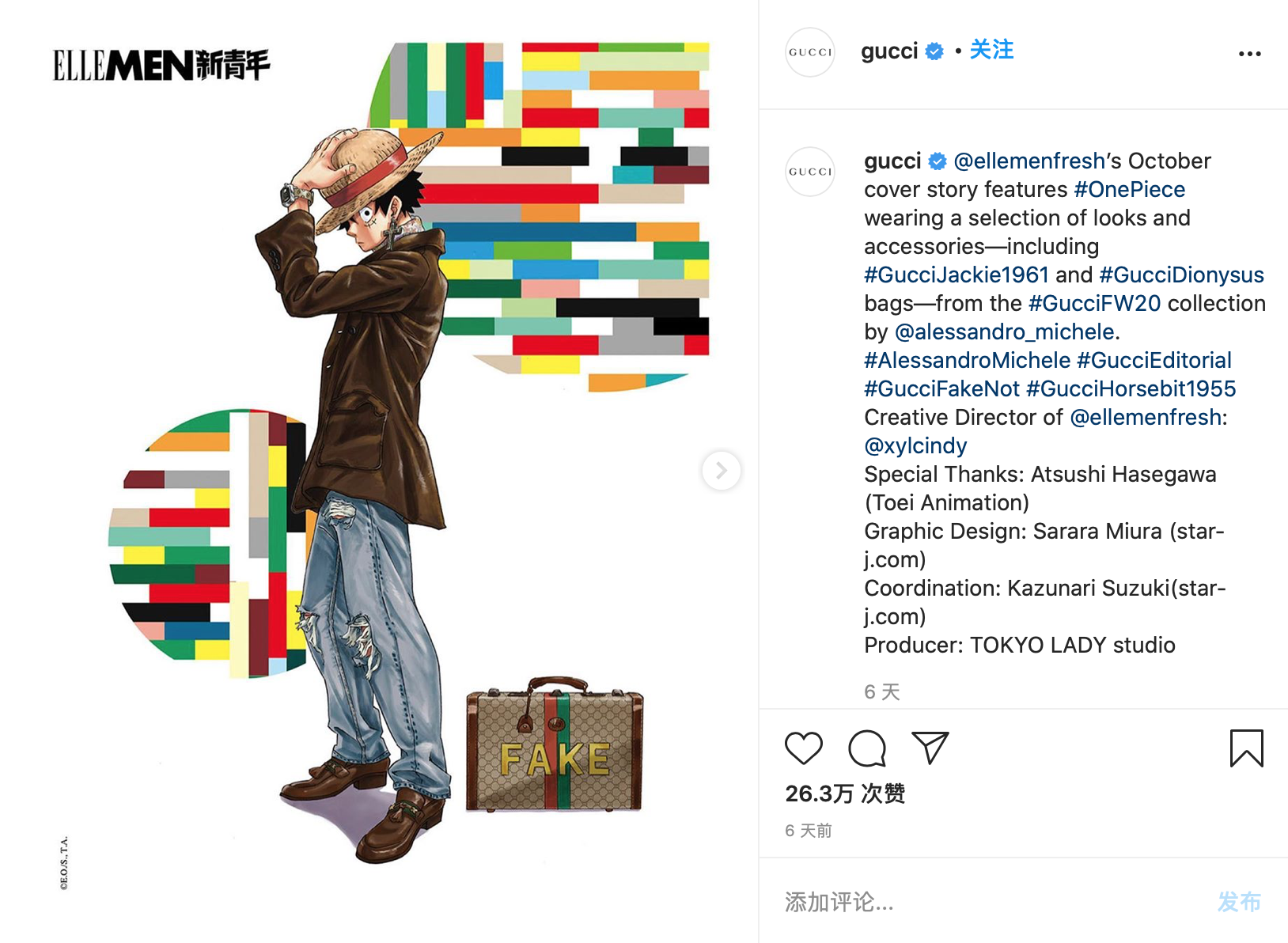 在最新一期的中國版《Elle Man》封面和內刊,漫畫人物路飛(Monkey D. Luffy)和佐羅(Roronoa Zoro)“穿上了”全套的Gucci 品牌2020秋冬系列,包括印有“Fake ”字樣的“Fake/Not”包袋。