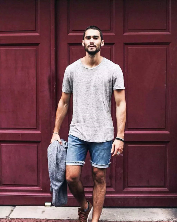 百搭的牛仔布料也能給略短的男士短褲增添一絲青春氣息,搭配白襯衫和球鞋,同樣也能有清新的效果。