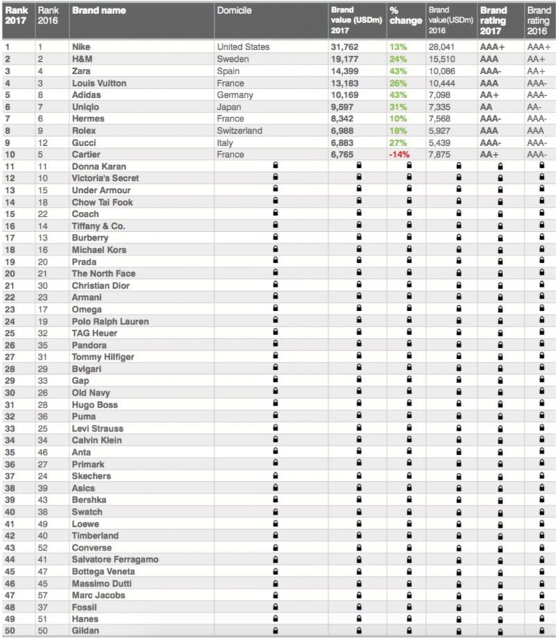 英國知名品牌評估機構 Brand Finance 近日公佈『2017 全球最有價值 50大時尚品牌』名單。美國運動服飾巨頭 Nike 蟬聯冠軍,品牌價值達 320億美元。Nike 也是時尚品牌榜上唯一一個達 AAA+ 評級的品牌,在 Brand Finance 全行業品牌價值排行榜中位列第三。 其他的品牌如H&M 與 Zara 緊追在後,一起來看分析數據。