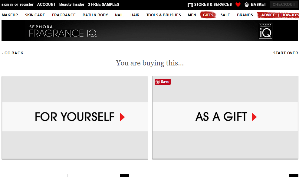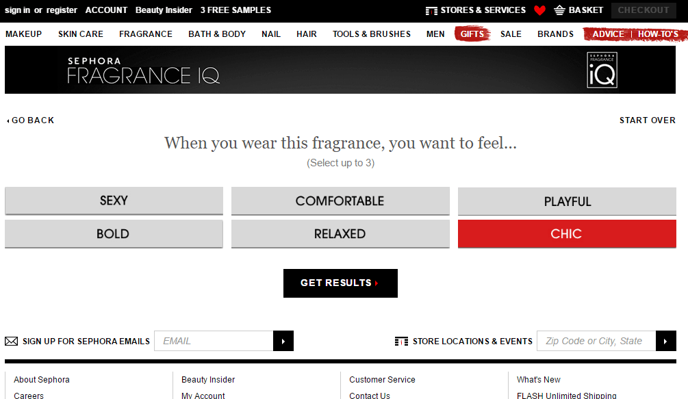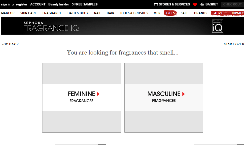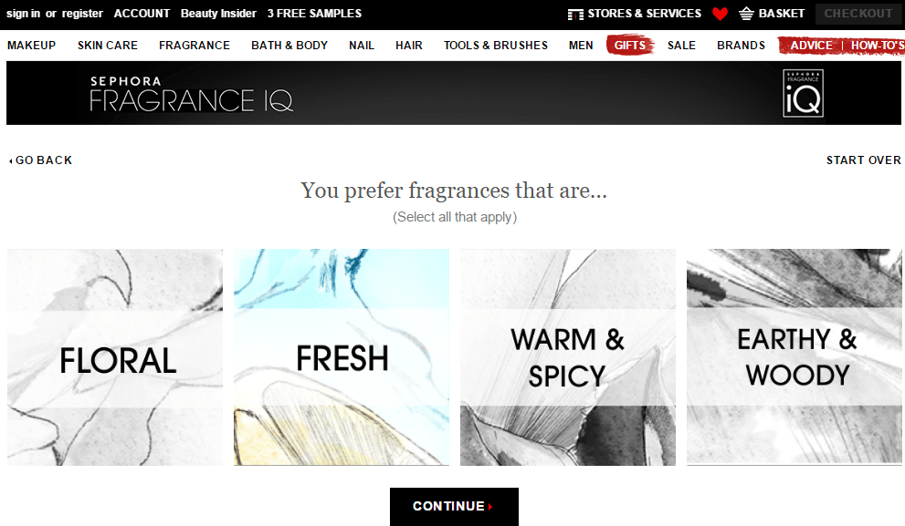 美妝連鎖Sephora絲芙蘭發展出一套香水測試,名為 Fragnance IQ,在網站上可以看見品牌通過一些最基本的問題瞭解顧客需求並進行香水推薦。 問題也不複雜,只要回答四個問題後就可以得到推薦的香水。