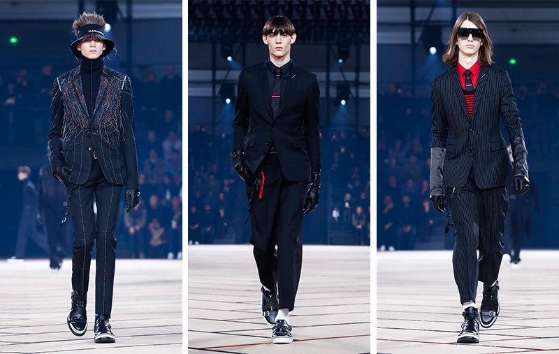 Dior Homme 這一季的主題是一個新造詞——HARDIOR(HARDCORE 加 DIOR),從拍照的背景板到秀場的地板,都貼滿了 HARDIOR 的字樣,整個系列躁動、不羈的基調不言而喻。創意總監 Kris Van Assche 的重心是為時下的年輕一代打造正裝,很多人都說現在的年輕人不喜歡穿西裝,他卻認為是現有的西裝不符合年輕人的口味。Kris 在這個系列中做了很多新鮮的嘗試,以修身的上衣搭配寬鬆的闊腿褲,以鏈條、彩色絲線等元素裝飾西裝,同時亦有運用拼接的設計。
