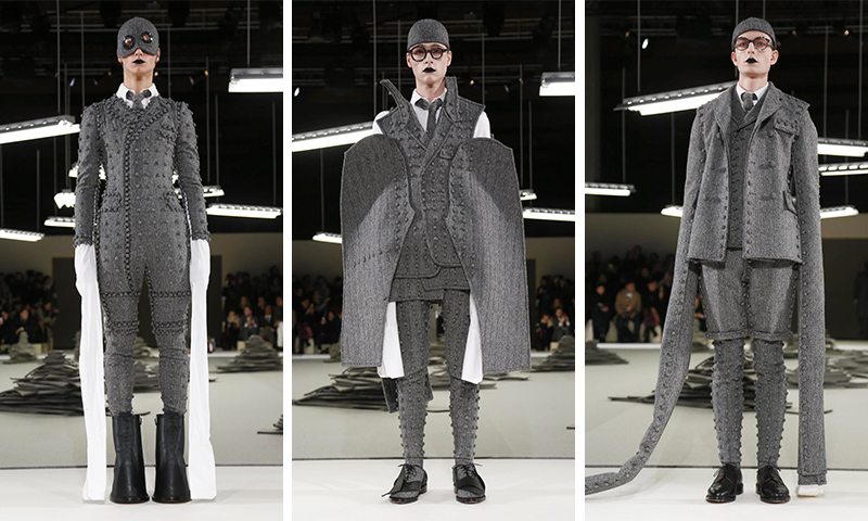 開頭的 15 套連體套裝仿佛一體成型,把西裝做成緊身連體的設計真是大膽;接下來的 15 套造型則是誇張的平面感設計;再接下來的 15 套則回歸到我們日常所穿的“正常”服裝。三組造型就像是我們給娃娃換裝一般,尤其是開頭的 15 套緊身設計,回過頭來一想仿佛是還沒有穿上衣服的初始狀態,非常有趣。至於這一季的主題,TB 直言並沒有任何的深意或者隱喻,單純就是關於灰色套裝的廓形以及比例。