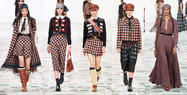 當Ruth Bell穿著一件深綠色燈芯絨西裝登場時,Maria Grazia Chiuri昭告了她創作的靈感來源——1970年代風格。Dior在1970年代的創意總監Marc Bohan的經典元素被大量展現在秀場上:層疊的格紋元素被裝飾在連衣裙夾克外套、以及長款風衣上;超短裙和貝雷帽的搭配則讓人聯想到了1970年代風起雲湧的學生運動和女性解放大潮。