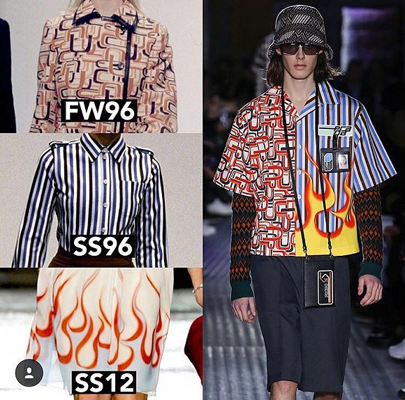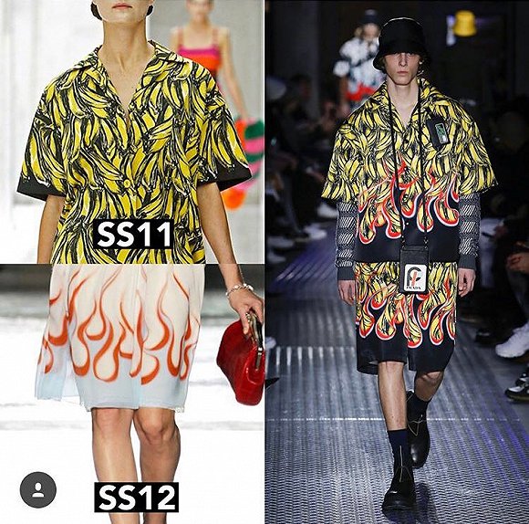 1996年秋冬系列的U型紋、1996年春夏系列的藍白條紋、2009年春夏系列的海洋生物、2012年春夏系列的火焰、2014年春夏系列的菊花……這些重新復活的圖案中,香蕉和火焰圖案的男士短袖加墊襯衫引起了很多人的注意,因為它最貴。