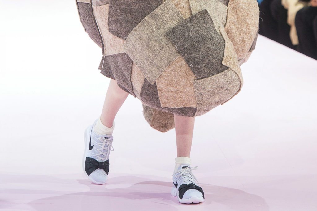 從秀場圖片我們可以看出,雙方此次合作選擇以白色 Flyknit 材質製作的 LunarEpic 為藍本出發,而鞋頭位置則加入了黑色「蝴蝶結」的設計作點綴,在保持跑鞋本身運動屬性的同時,大大增加了鞋款的時尚感和柔美氣息。
