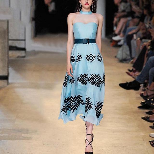這款清爽藍色連衣裙,色彩清新亮麗,上半身掛脖網紗設計顯得更加迷人誘惑,看著就心曠神怡,精緻的腰部設計使得腰線更高!