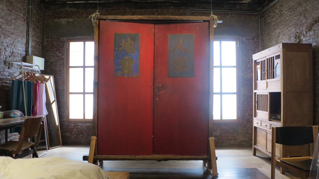 來到二樓的客房,偌大20坪空間十分寬敞,磚塊牆面與高挑的木頭屋頂、古豪宅紅色大門、一桌一椅、和室書屋都成為民宿從過去找尋歷史風華的印證。