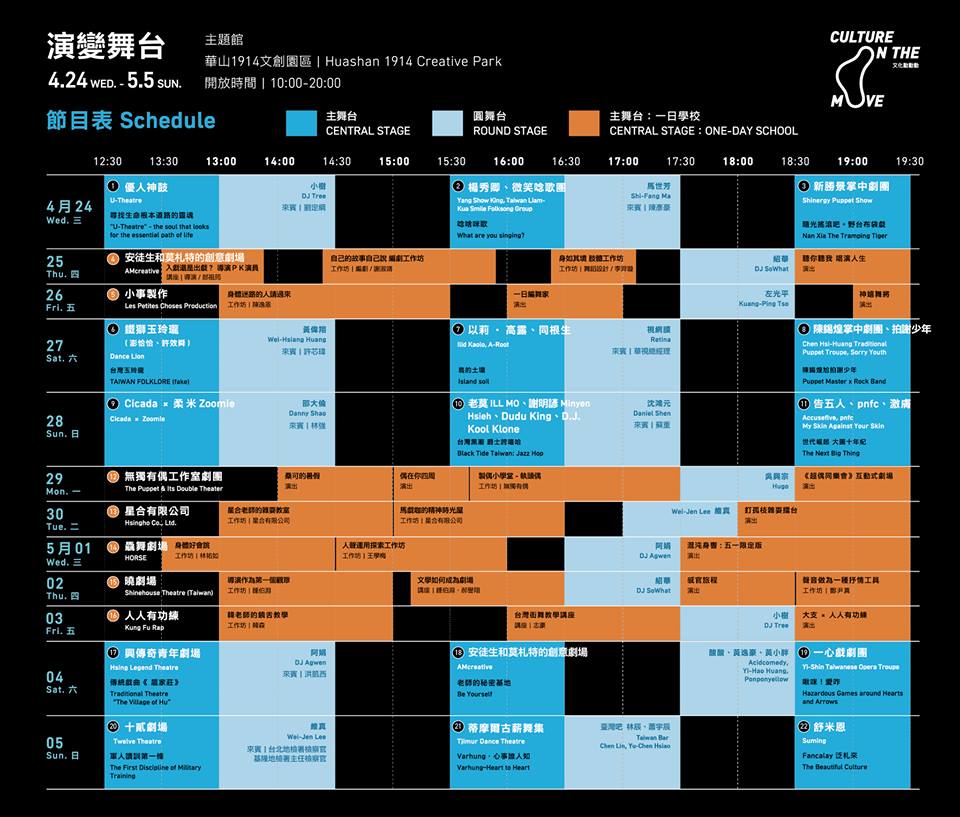 華山四連棟化身表演舞台,透過表演與記錄雙主軸,引領觀眾看見臺灣表演藝術的精彩樣貌。本次陣容超級精彩,從家喻戶曉的鐵獅玉玲瓏、布袋戲大師陳錫煌對尬臺味搖滾拍謝少年、謝明諺的慵懶爵士碰上老莫的硬底饒舌,再到課題有趣的一日學校系列(如小事製作的〈一日身體博物館〉、前太陽馬戲團陳星合的〈釘孤枝文博限定場〉)等,更有Street Voice音樂總監小樹率領金牌陣容、華麗獻聲,每日現場脫口秀Online放送。預計在12天展期中,將呈現共56場的講座、工作坊、互動式展演等演出。