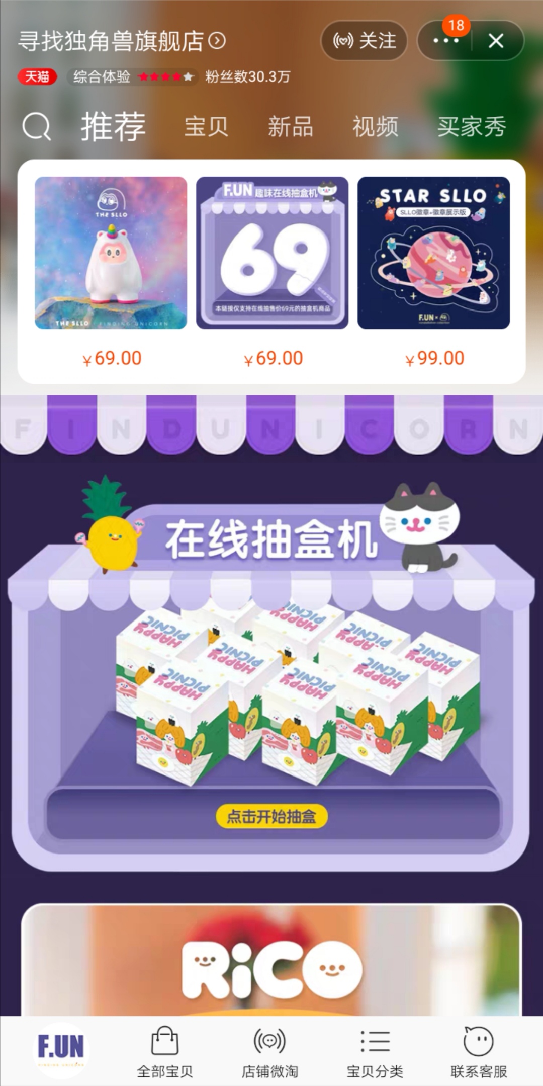 在線抽盒機購物小程序位於“尋找獨角獸”天貓旗艦店首頁最顯眼的位置