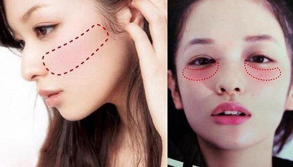 宿醉型的腮紅即為在眼睛下方處塗抹的高位腮紅,是近年在日本流行的腮紅畫法適合搭配可愛甜美的服飾並建議使用日系品牌的腮紅。