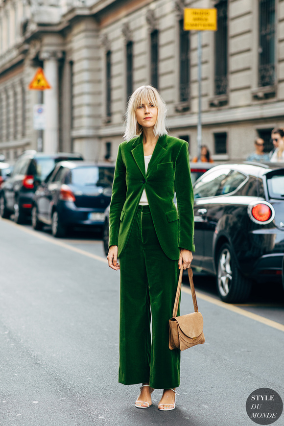 天鵝絨最大膽的穿法是把它“從頭穿到尾”,一套天鵝絨西裝套裝絕對是最吸睛的搭配。不過這種穿法也很冒險,適合氣場夠強的時髦達人。