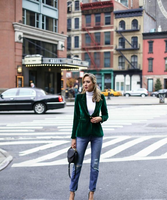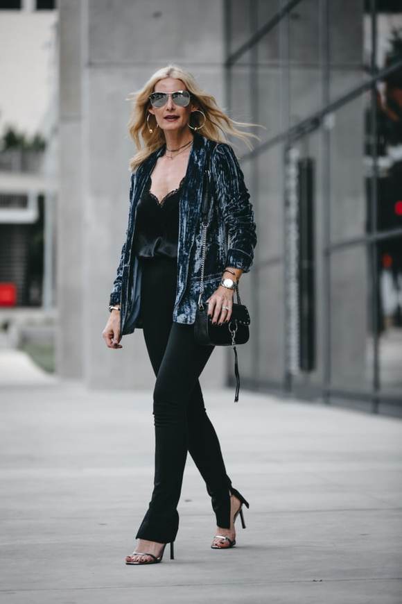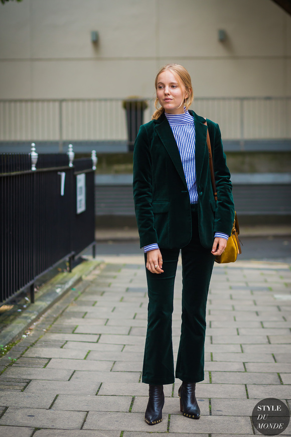 不過,天鵝絨西裝也適合和不同的內搭打造突出的層次感,高領毛衣、白T卹、蕾絲背心和條紋襯衫都是很不錯的選擇。