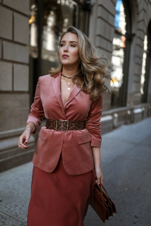 除此之外,如果你不想穿成行走的沙發套,天鵝絨西裝套裝正確的打開方式是再多加幾件配飾,可以是項鍊、手鍊,也可以是顏色有反差的手袋。