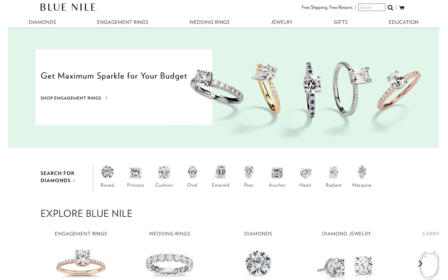 事實上,Blue Nile 的前身是美國傳統珠寶零售商 Williams&Son Inc. 1995年推出的鑽石電商網站。1998年,貝恩公司的管理顧問 Mark C. Vadon 在這個網站上買了一個訂婚鑽戒。第二年,Mark C. Vadon 籌集了600萬美元收購了該網站85%的股權,對網站進行升級,並將公司名改為 Blue Nile。