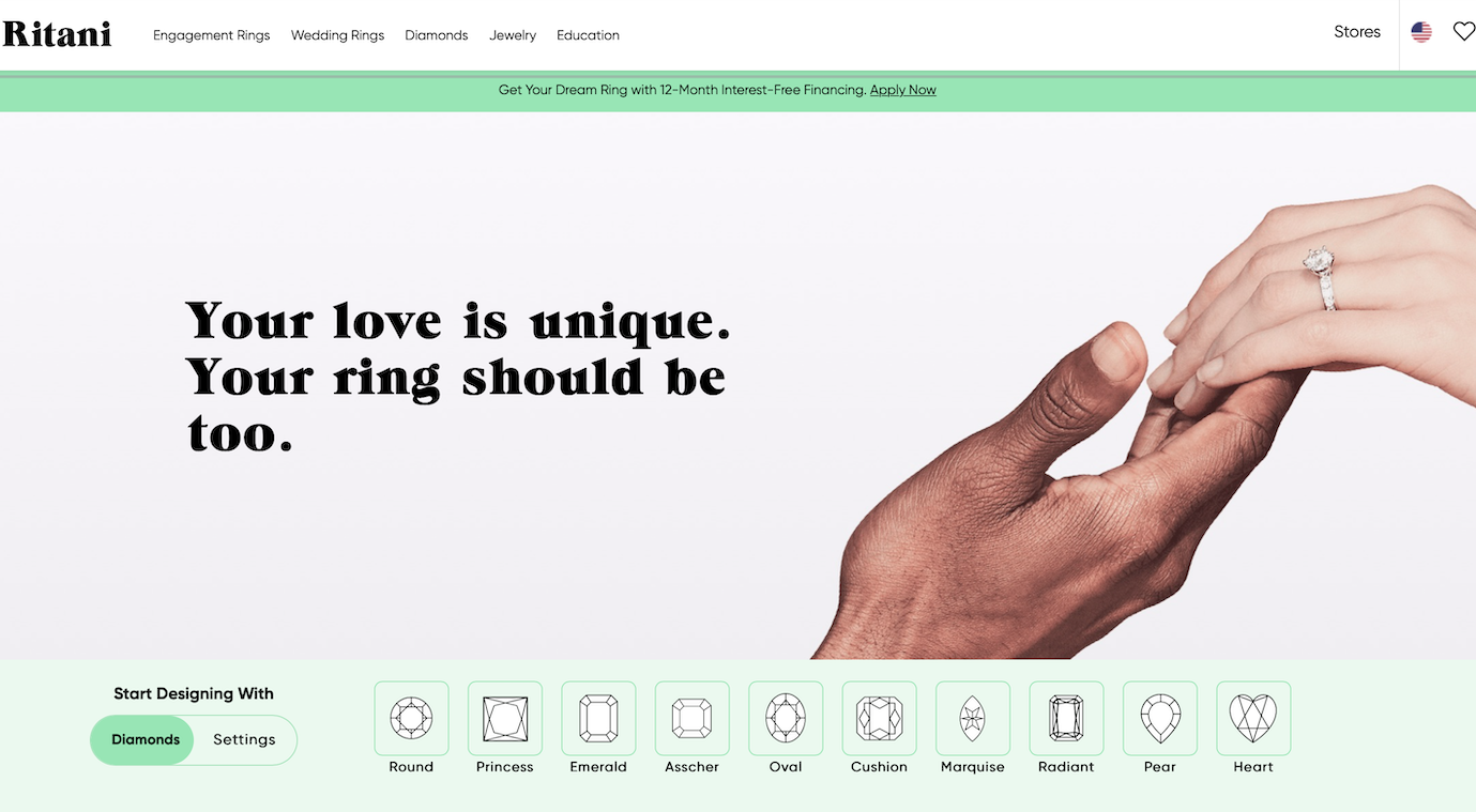 創立於2011年,Ritani 是一家專注於訂婚戒指和婚嫁珠寶的高端珠寶公司,總部位於紐約。最初的 Ritani 是一家珠寶批發商,後於2012年推出了電商網站。顧客可以在線上定製一款訂婚戒指,然後去臨近的珠寶店試戴。2014年,Ritani 憑藉其“線上購買,線下試戴”的商業模式,入選《FORBES》評委“美國最具前景的公司”榜單。