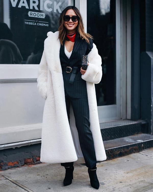 穿厚大衣且顯得不臃腫最簡單的方法是穿一半露一半,大衣敞開穿,可適當顯露出好身材,而且還能把手臂、腰部、臀部和大腿的小肉肉完美的隱藏起來。