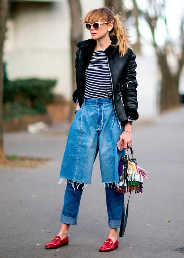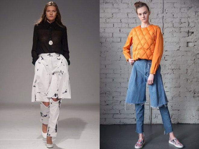 這股流行潮流必非來自4大時尚之都,讓人意想不到的是,Demi-Denims潮流最早是一位住在烏克蘭首都基輔的設計師Ksenia Schnaider帶出來的。前不久,她見到自己的一位朋友穿了一件高腰的牛仔褲,於是她建議人家把褲子剪成一個與眾不同的女裙褲,上面還保持著寬鬆的廓形,在膝蓋處剪開,最後在小腿收攏。於是,這種二合一的牛仔單品就出現了。