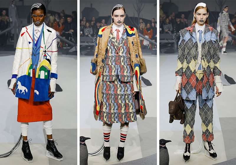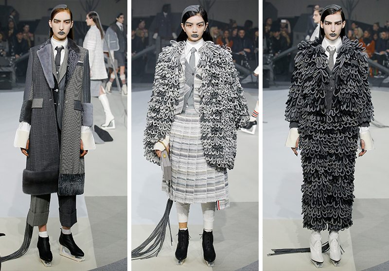 看完發佈會你會感受到 TB 在寒冷中帶給你的溫度,秀場被設定為“南極”,那些呆萌的企鵝玩偶就是最好的證據,模特們都穿上了“冰刀鞋”,棉襖、羽絨服、皮草等材質也都上陣了。整個系列可以分為三個部分,灰色調、彩色、黑白,設計師這一季在面料上下了大工夫,湊近看細節非常豐富。