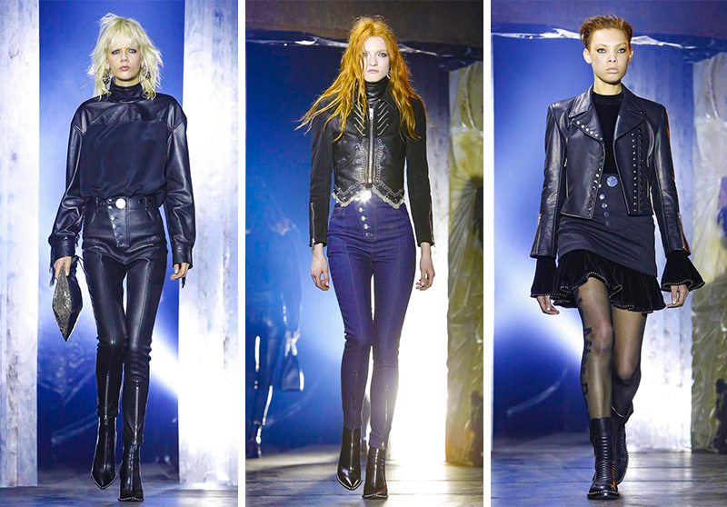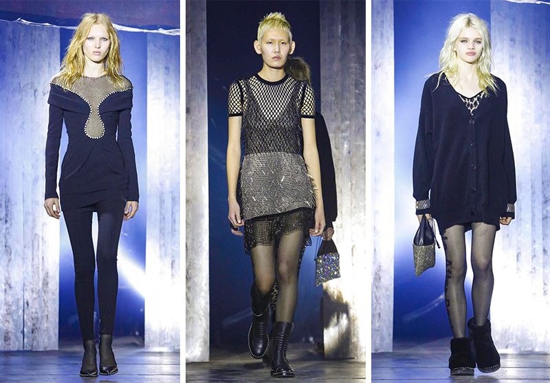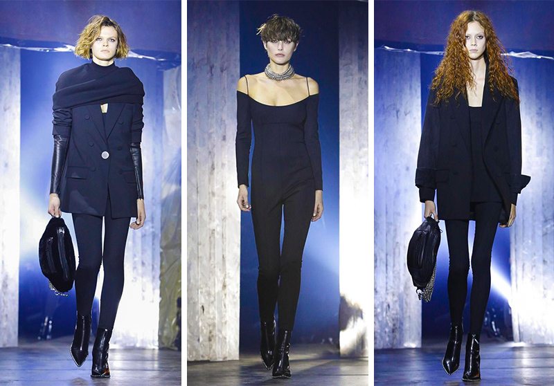 王大仁獻出了近年來最暗黑的一季,單純從色彩來講,38 套造型中超過 30 套是 all-black,剩下的幾套是灰色,全場唯一一套比較“白”的造型由 Bella Hadid 演繹,白色針織衫上印著地下朋克樂隊“NIGHT OF TREASON”的字樣,暗黑、朋克、叛逆奠定了 Alexander Wang 的主調。設計一如既往不繁複、不邋遢,從首飾、包袋到服裝都大量地使用了金屬,在暗黑之餘更多了一份強硬的力量。