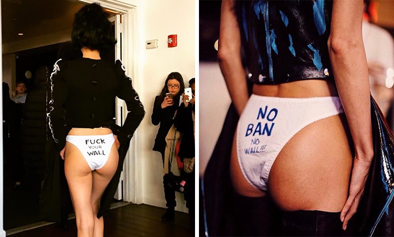 即便是曾經公開表示支持川普的 Kanye West 也在 Yeezy Season 5 發佈會上讓穆斯林超模戴著頭紗走秀,以此抗議川普的“禁穆令”。而 LRS Studio 的反抗就更加直白了,設計師讓模特穿上了印有反川普標語的內褲走秀,“FUCK YOUR WALL”、“NO BAN NO WALL”等口號背後的態度不能更明瞭了,這位設計師出生在墨西哥,此舉正是抗議川普建造邊境牆的決定。