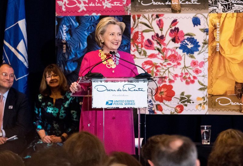 而時裝周結束後,Oscar de la Renta 紀念郵票發佈會更是請來了希拉蕊,鮮豔的玫紅色外套和誇張的金色項鍊,較之其以往的穿衣更加大膽時髦。希拉蕊在這一活動中的亮相也從側面印證了美國時尚圈對於川普政府的不滿,包括 Anna Wintour 在內的許多重量級人物在競選時就站在川普的對立面,雖然如今木已成舟很多人的態度都不再那麼強硬,但整個行業卻在釋放著更強烈的不滿。