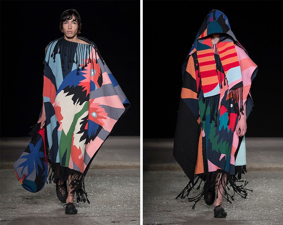 Craig Green 這一季在配色和紋樣上著實驚豔了一把,大廓型的斗篷上通身覆蓋色彩鮮豔的印花,藝術化處理的紋樣相當別致。