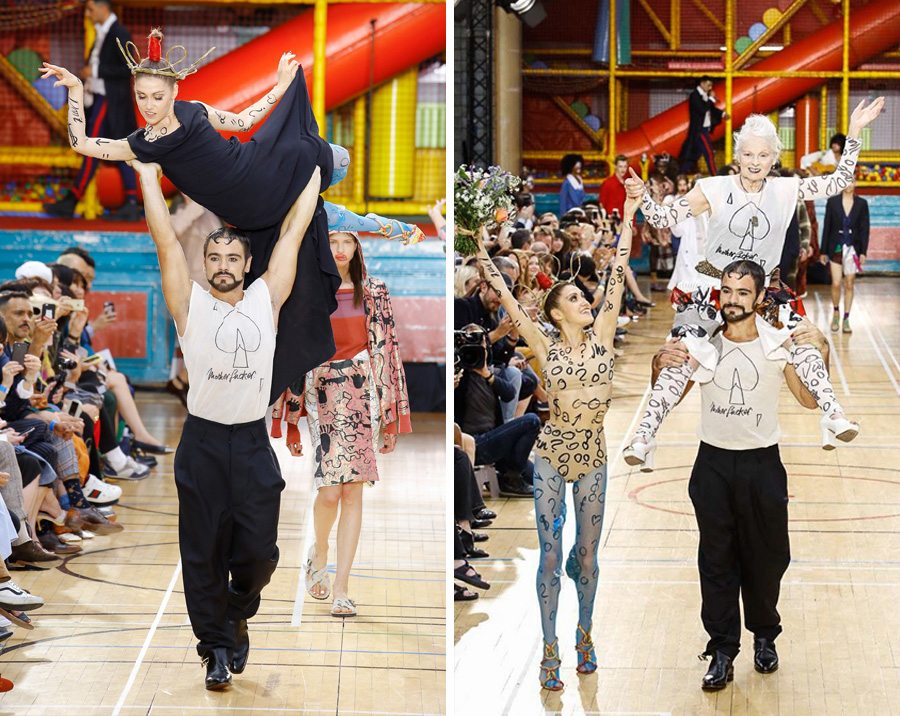 Vivienne Westwood極盡瘋狂的發表會,先不說衣服,大紅唇、小丑臉的模特們扭動這身體以奇異的姿勢走秀,中間還有全身赤裸只穿了一條內褲身上塗滿塗鴉的,有被托舉出來的,就連設計師本人謝幕都是騎在男模身上出來的。