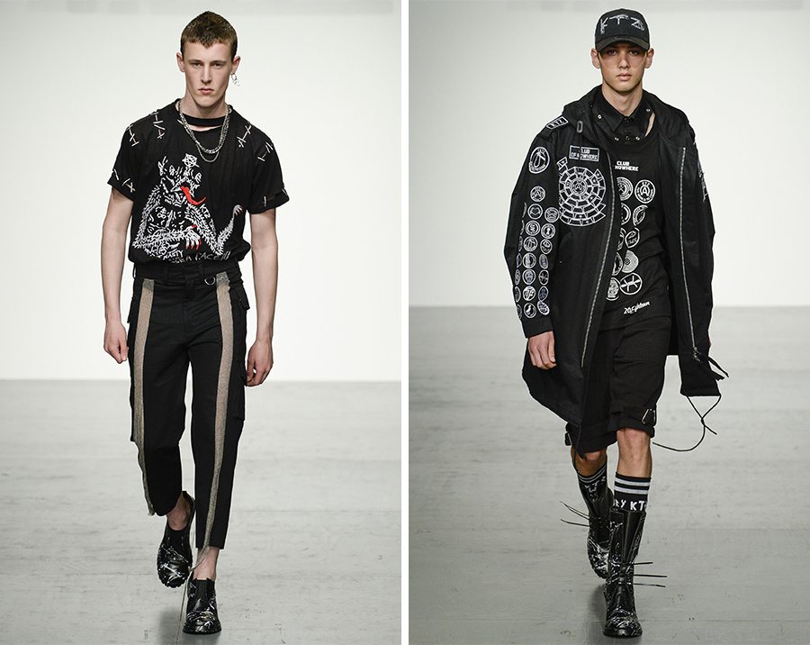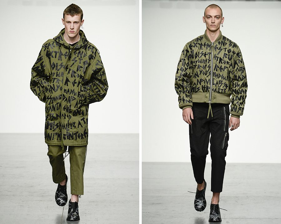 這同時也暗示著 2018 春夏系列文字印花或將流行,KTZ 秀場上也有文字印花設計出現,軍綠色單品上覆蓋著塗鴉文字,頗為吸睛。