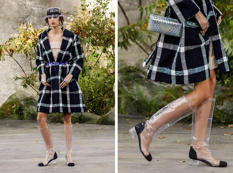 CHANEL 今年在巴黎大皇宮造了一個園林,有山有水有橋好不愜意。本季的設計主角是透明 PVC 材質,從帽子、靴子、手袋、手套、雨披都大面積地使用了這種已經不那麼新鮮的未來感材料。