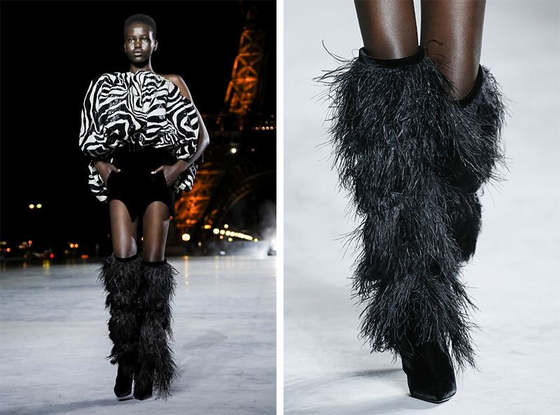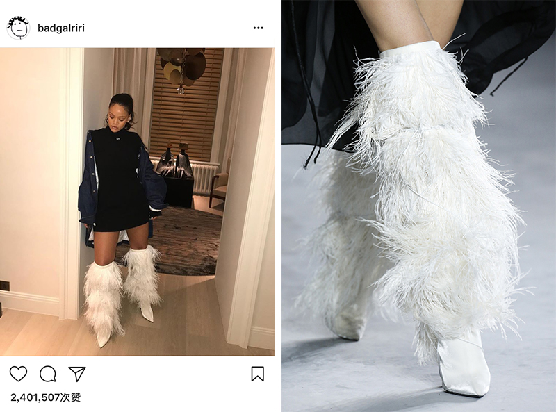 不過腳上的風景也是無限好看,羽毛元素是其中的主角,或是點綴綁帶高跟鞋,或是佈滿筒靴。秀後蕾哈娜已經上腳,還特別在 Instagram 上曬出買家秀。