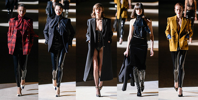 光滑的乳膠材質貫穿了整場大秀,這種被認為帶有地下文化色彩的材料常常被認為是反叛主流文化的代表。從緊繃著雙腿的及膝長褲、擠壓走路步伐的包臀緊身裙再到流露出肩部曲線的蝴蝶結抹胸上衣,Anthony Vaccarello將戀物癖的時尚施加於一個年銷售超過十億歐元的大眾奢侈品牌上,並通過種種經典的造型來平衡其中所包含的顛覆性。