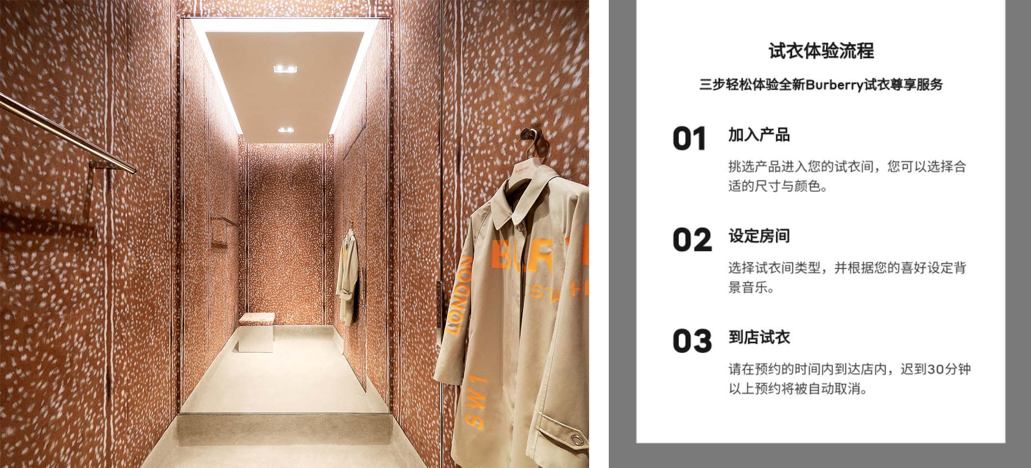 在“Burberry 空· 間”,用戶可通過微信小程序預先挑選自己喜歡的產品,預約喜歡的試衣間主題、到店時間,甚至提前選擇背景音樂。