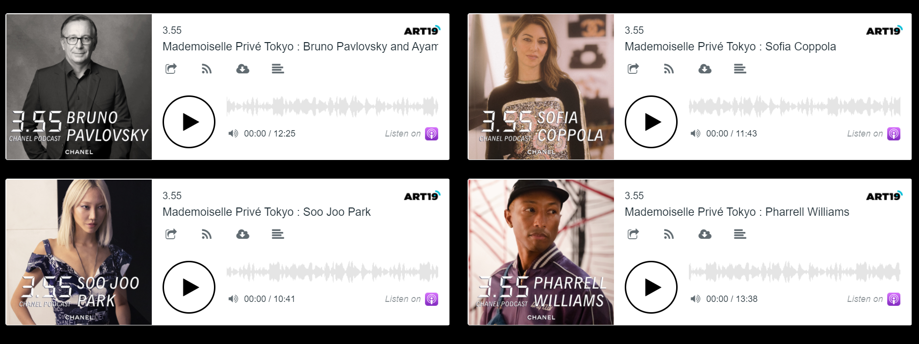 這一系列共8集(目前更新7集),對話嘉賓包括:音樂人Pharrell Williams, 演員Tilda Swinton, 舞者Akram Khan,藝術家Arthur Jafa,設計師Es Devlin,導演王子逸等。聽眾可選擇Chanel 官網、蘋果播客和Spotify 三個平台免費收聽全部節目內容。